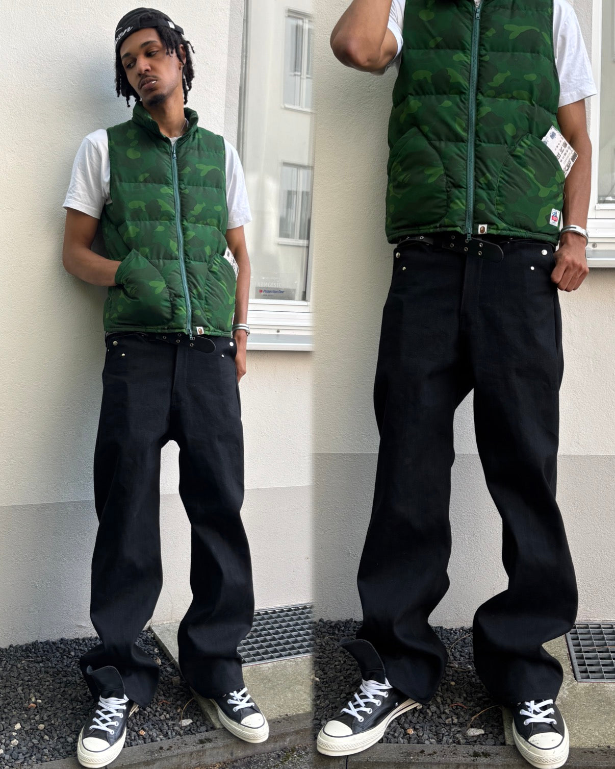 Made from 17oz japanese selvedge denim .The stiffness, mule ear pockets combined with crazy fit deliver a unique look.